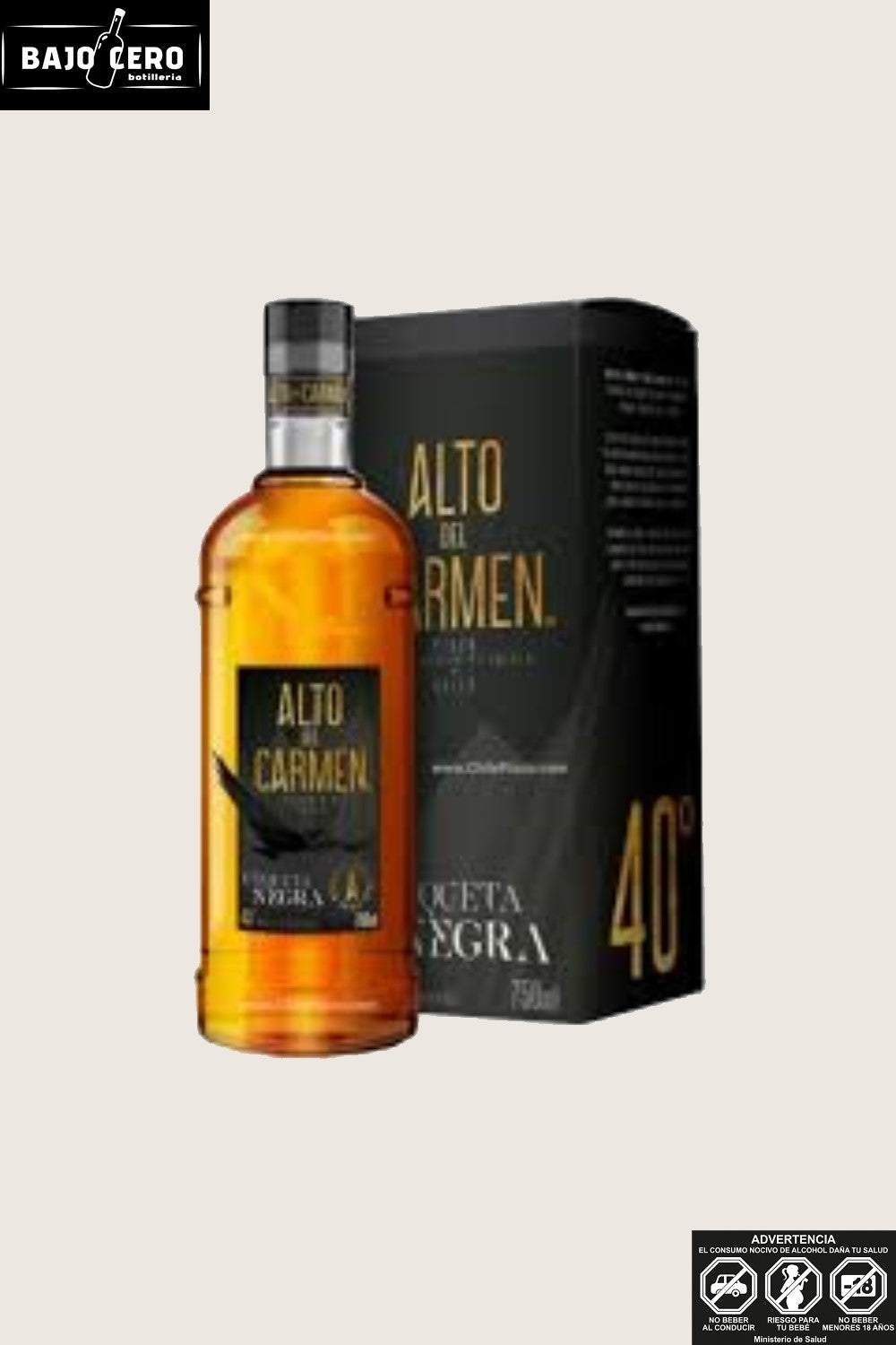 Alto del Carmen Etiqueta Negra 40° es un pisco fabricado con un tipo de uva Moscatel Rosada y Moscatel de Alejandría. Guardado dos años o más en barricas de roble americano lo que le da color ámbar intenso, limpio y brillante. De piernas finas y persistentes. En nariz: intensidad alta de moscatel evolucionado.