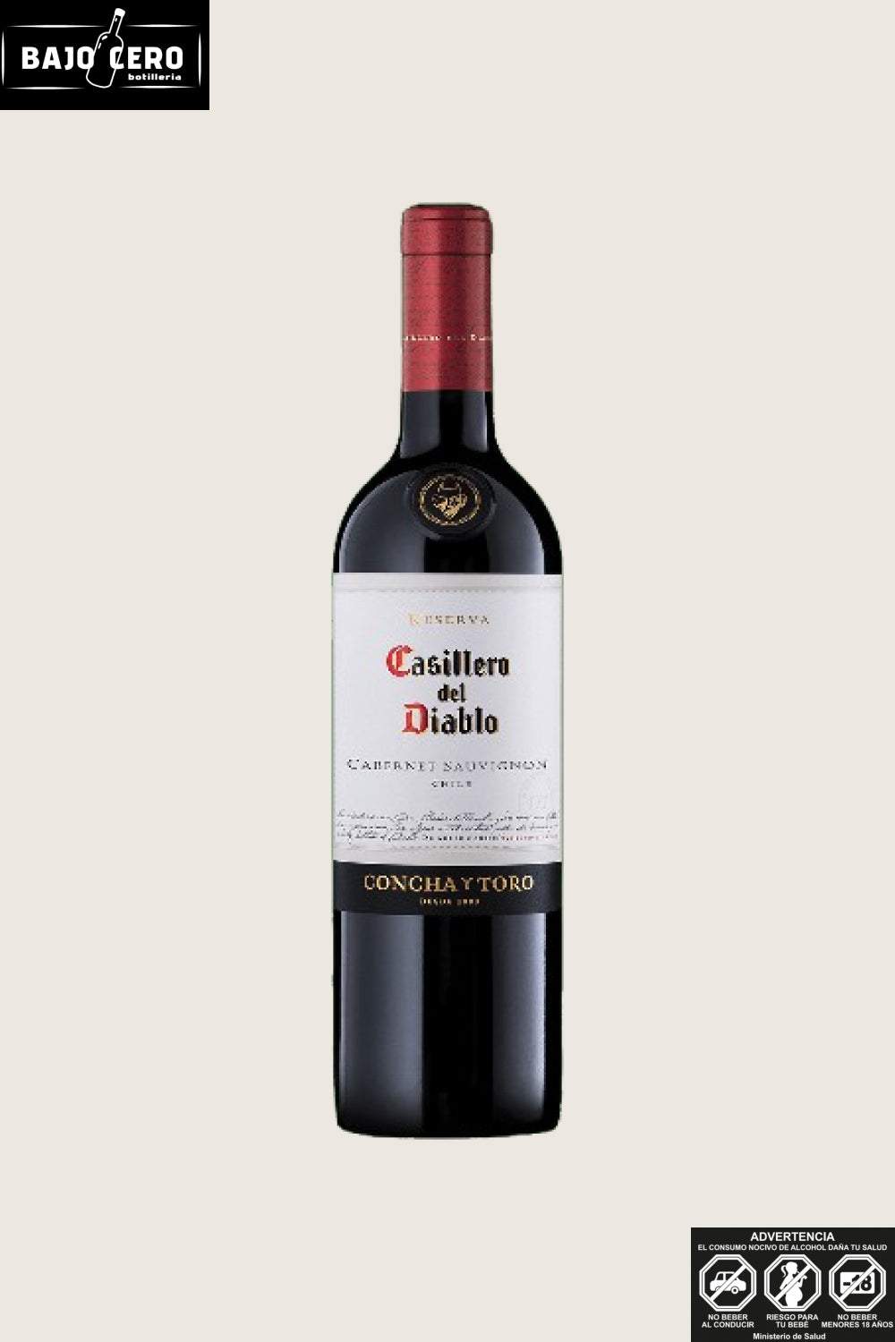 El Vino Casillero del Diablo Reserva Cabernet Sauvignon 750ml es un vino tinto chileno de Viña Concha y Toro, elaborado con uvas Cabernet Sauvignon del Valle Central. Con un grado alcohólico de 13,5°, exhibe un color rojo rubí intenso y aromas a frutos negros como moras y ciruelas, con notas de vainilla y especias dulces por su crianza en roble. En boca, es estructurado, con taninos firmes y un final equilibrado, ideal para carnes rojas, asados o quesos maduros. Encuéntralo en Botillería Bajo Cero.
