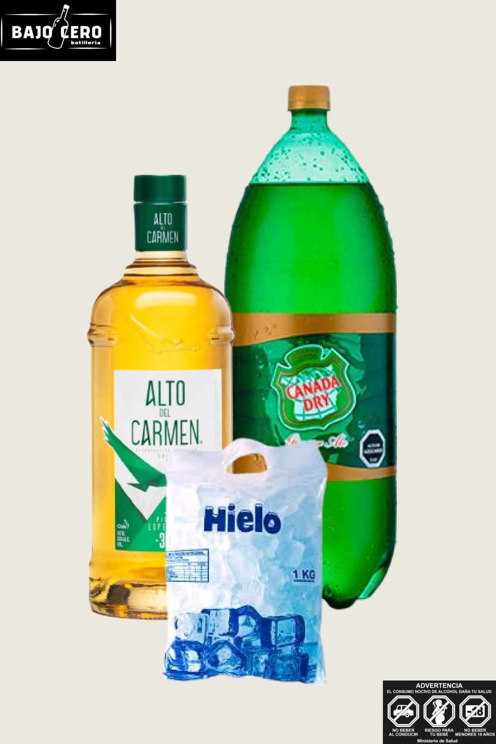 Promo pisco alto del Carmen 35º 1L + canada dry ginger ale 3L+ hielo 1kg