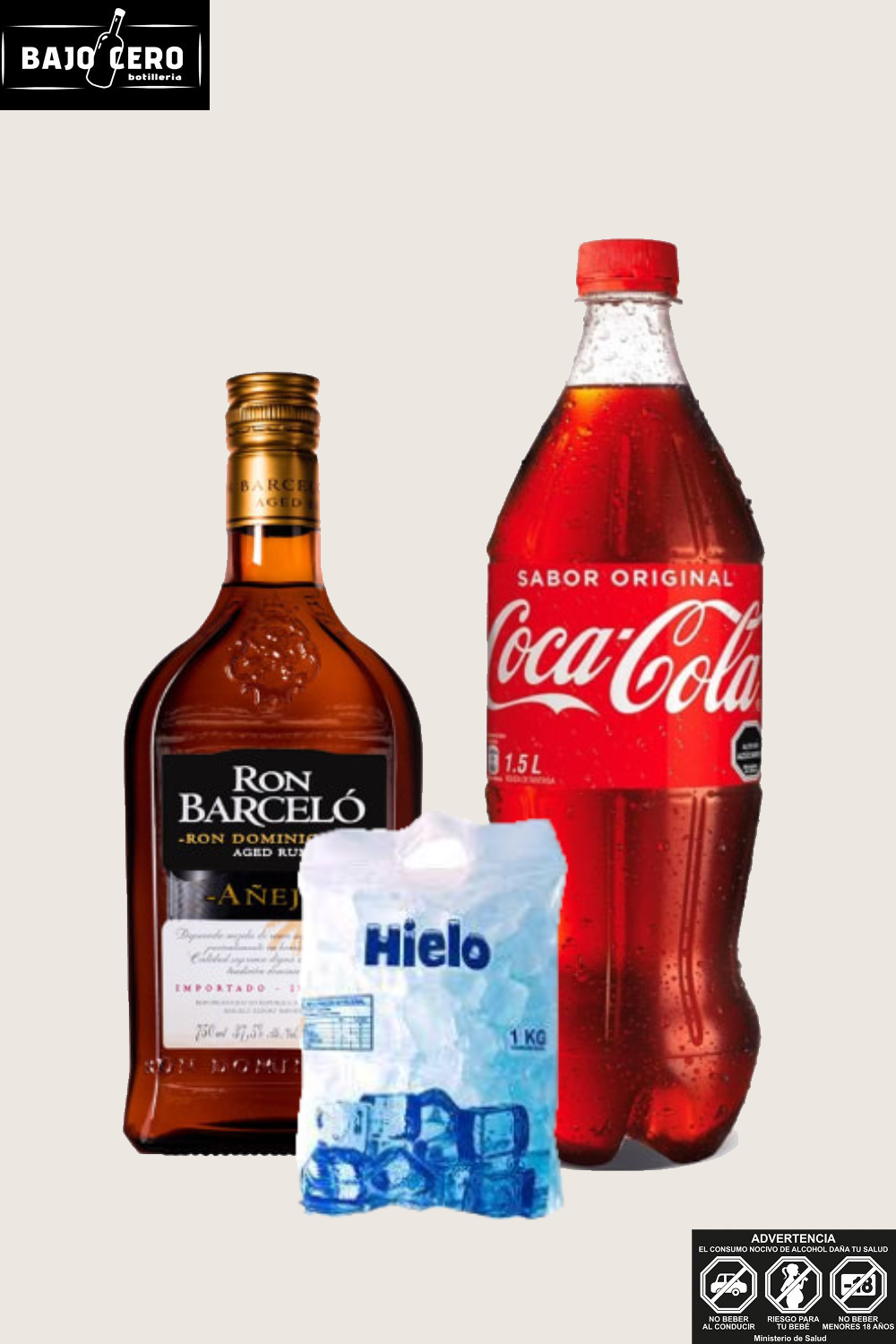 RON BARCELO AÑEJO 750CC + COCA 1.5 LT + HIELO